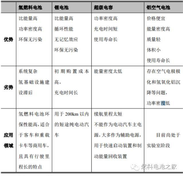 目前在交通运输用动力源方面,主要有四种技术路线:锂离子电池、氢燃料电池、超级电容和铝空气电池。其中锂离子电池、超级电容和氢燃料电池得到广泛的应用,而铝空气电池尚处于实验室研究阶段。能源补给方面,锂离子电池、超级电容适用于纯电动汽车,但是需要外部充电,而氢燃料电池汽车则需要外部氢气加注,铝空气电池则需要补充铝板和电解液。